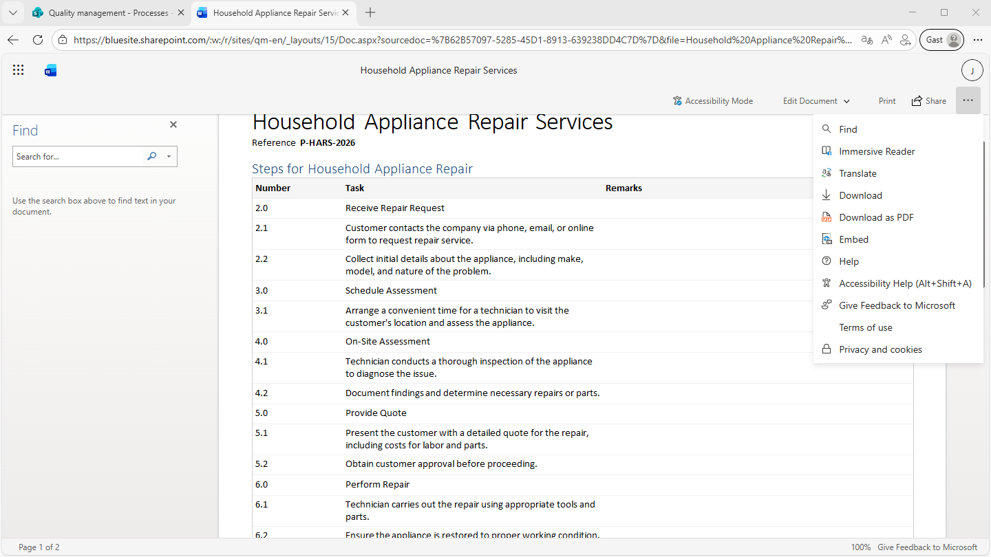 Microsoft 365 automatically opens documents in Reading View if the person is only allowed to read the document. This applies to all employees who are website visitors to the Quality Management Website. In addition to viewing, this view offers full-text search, language translation, printing and downloading.