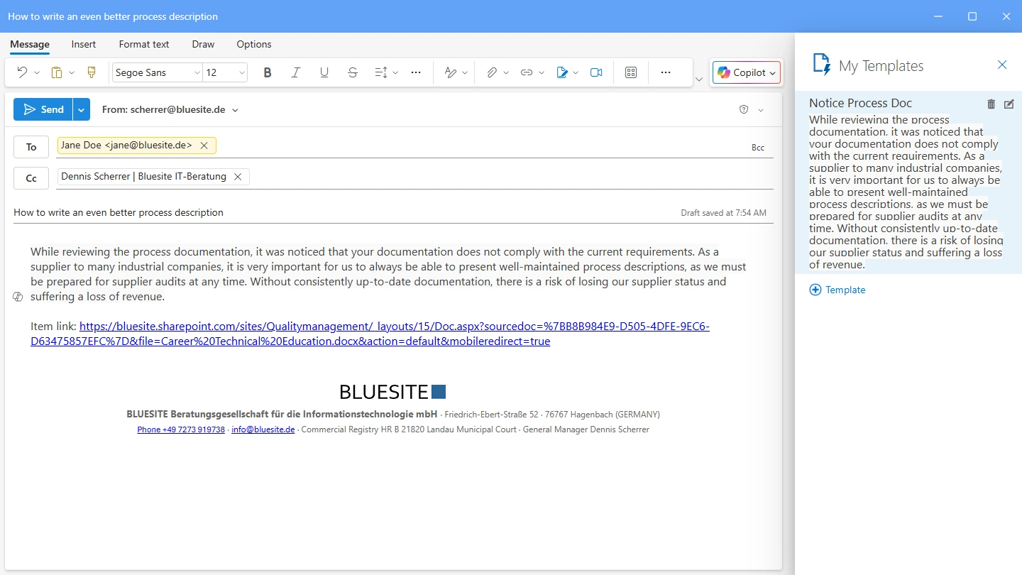 Responsible people need to review and update process documentation, standard operating procedures (SOP) and other documentation. This documentation must comply with internal policies and international standards. Quality management officers often need to share internal policies with the person responsible for a specific process or procedure. It is good practice to be prepared when they ask for links to policies! Using a fine combination of a SharePoint quick step and an Outlook template, you can answer in seconds.