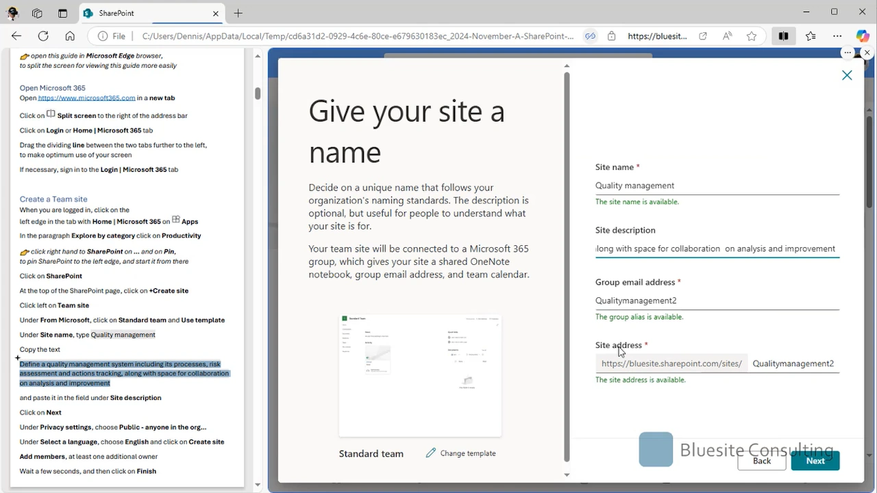 Step-by-step instructions for creating lists and libraries for actions, processes, quality objectives,